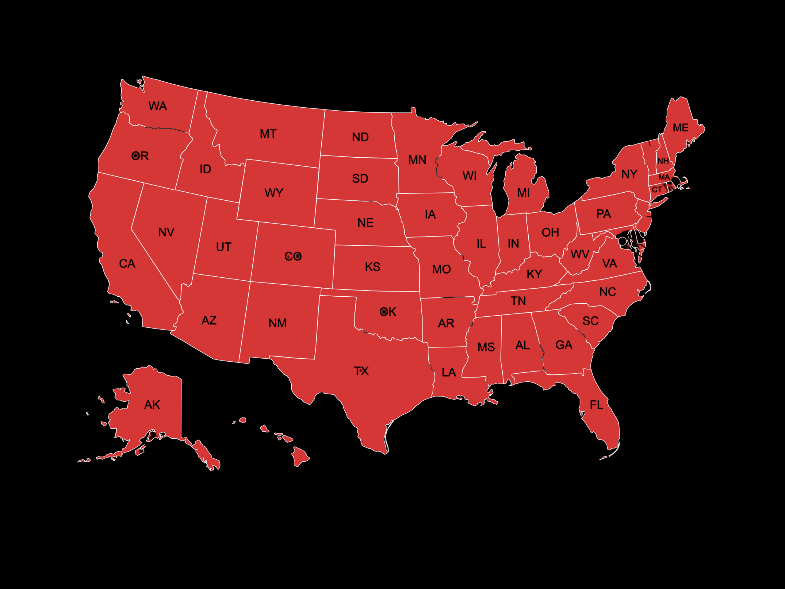 Alabama Alaska Arizona Arkansas California Colorado Connecticut Delaware Florida Georgia Hawaii Idaho Illinois Indiana Iowa Kansas Kentucky Louisiana Maine Maryland Massachusetts Michigan Minnesota Mississippi Missouri Montana Nebraska Nevada New Hampshire New Jersey New Mexico New York North Carolina North Dakota Ohio Oklahoma Oregon Pennsylvania Rhode Island South Carolina South Dakota Tennessee Texas Utah Vermont Virginia Washington West Virginia Wisconsin Wyoming